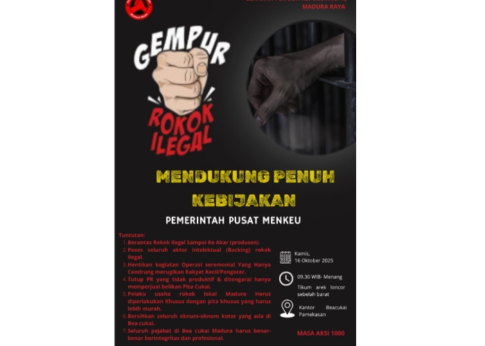 “Kami datang bukan untuk membuat gaduh tapi untuk mengingatkan. Ini gerakan moral agar pemerintah khususnya Menkeu Purbaya, tahu bahwa rakyat Madura siap mendukung langkah berani melawan rokok ilegal,” pungkasnya.