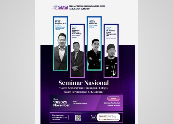 Flayer resmi Seminar Nasional “Green Economy dan Tantangan Ekologis dalam Perencanaan KEK Madura” yang digelar SMSI Sumenep besok, Kamis (13/11/2025) di Gedung Auditorium UNIBA Madura. Foto/Klik Times.