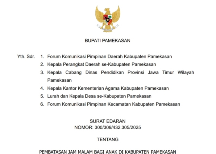 PAMEKASAN | KLIKTIMES.ID – Pemerintah Kabupaten Pamekasan resmi memberlakukan pembatasan jam malam bagi anak-anak dan pelajar di bawah usia 18 tahun. Kebijakan ini tertuang dalam Surat Edaran Nomor 300/309/432.305/2025 yang ditandatangani langsung oleh Bupati Pamekasan, KH. Kholilurrahman, Rabu (26/11/2025).