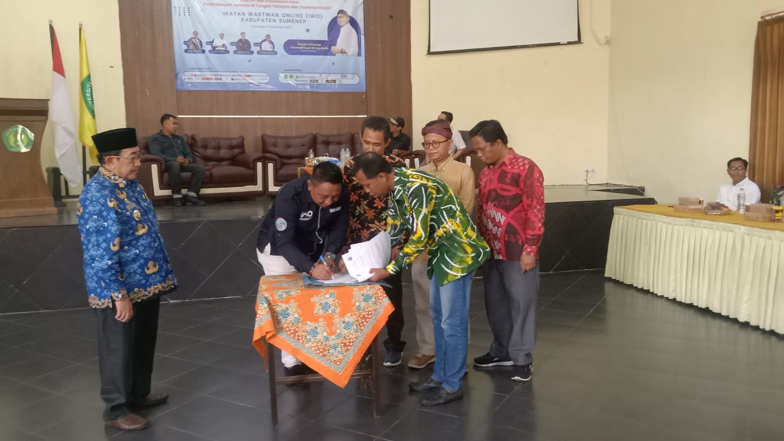 Penandatanganan MoU antara IWO Sumenep dan Universitas PGRI Sumenep, disaksikan Wakil Bupati Sumenep KH. Imam Hasyim. Foto/Klik Times.