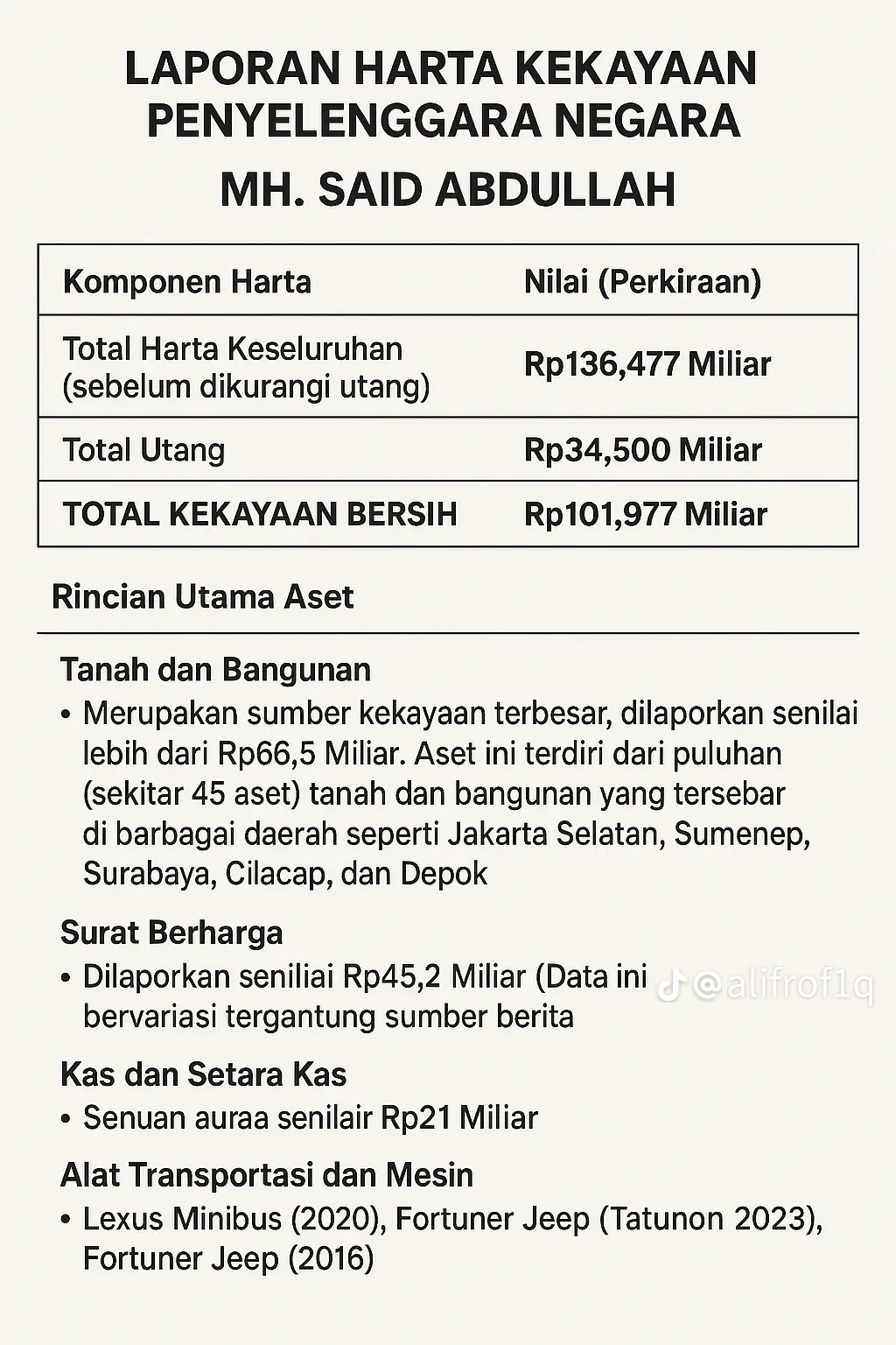 Dalam laporan tersebut, total harta keseluruhan Said Abdullah mencapai Rp136,477 miliar, terdiri atas berbagai jenis aset, mulai dari tanah, bangunan, surat berharga, hingga kendaraan pribadi. Nilai fantastis itu menempatkannya sebagai salah satu legislator dengan harta kekayaan terbesar di Senayan.