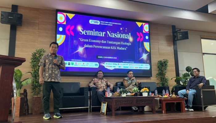 SUMENEP | KLIKTIMES.ID – Serikat Media Siber Indonesia (SMSI) Kabupaten Sumenep menggelar seminar nasional bertajuk “Green Economy dan Tantangan Ekologis dalam Perencanaan Kawasan Ekonomi Khusus (KEK) Madura” di Auditorium Universitas Bahaudin Mudhary (Uniba) Madura, Rabu (12/11/2025).