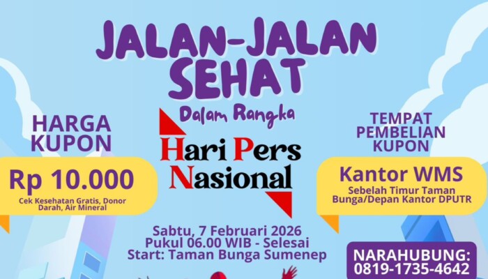 SUMENEP | KLIKTIMES.ID – Serikat Media Siber Indonesia (SMSI) Kabupaten Sumenep mengemas peringatan Hari Pers Nasional (HPN) 2026 melalui sejumlah kegiatan yang melibatkan masyarakat luas. Salah satu agenda pembuka yang akan digelar adalah Jalan Sehat di kawasan Taman Adipura, Kota Sumenep, pada Sabtu (7/2/2026).