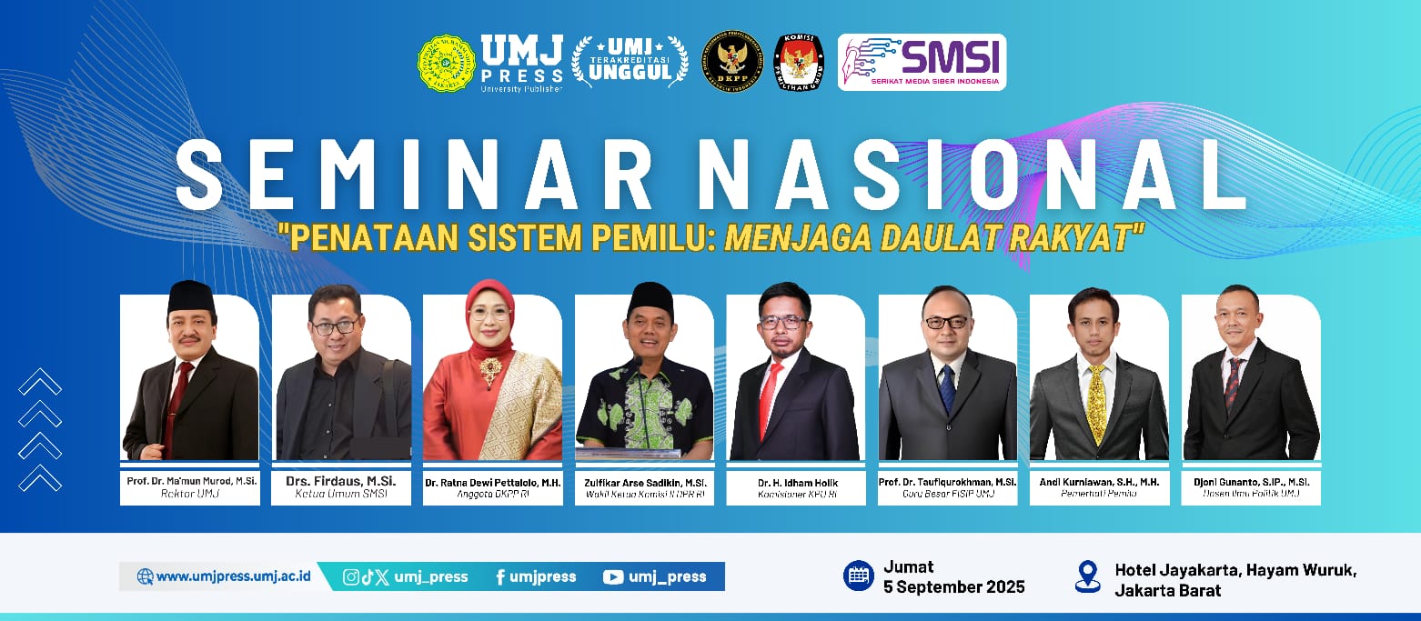 Seminar nasional ini akan dipandu oleh Djoni Gunanto dan menghadirkan sejumlah narasumber kompeten, di antaranya anggota Dewan Kehormatan Penyelenggara Pemilu (DKPP) RI, dr. Ratna Dewi Pettalolo; Wakil Ketua Komisi II DPR RI, Zulfikar Arse Sodikin; Komisioner KPU RI, Dr. H. Idham Holik; Guru Besar FISIP UMJ, Prof. Taufiqurrahman; serta pakar hukum Andi Kurniawan, SH, MH.